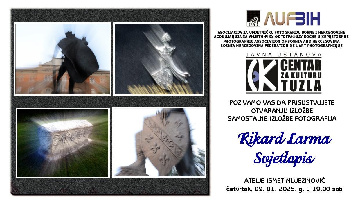 Samostalna izložba fotografija Rikarda Larme pod nazivom “Svjetlopis”, u organizaciji Asocijacije za umjetničku fotografiju Bosne i Hercegovine i Centra za kulturu Tuzla, će biti otvorena u četvrtak, 09.januara 2025.godine u 19:00 sati u ateljeu Ismeta Mujezinovića Tuzla (Klosterska 19).