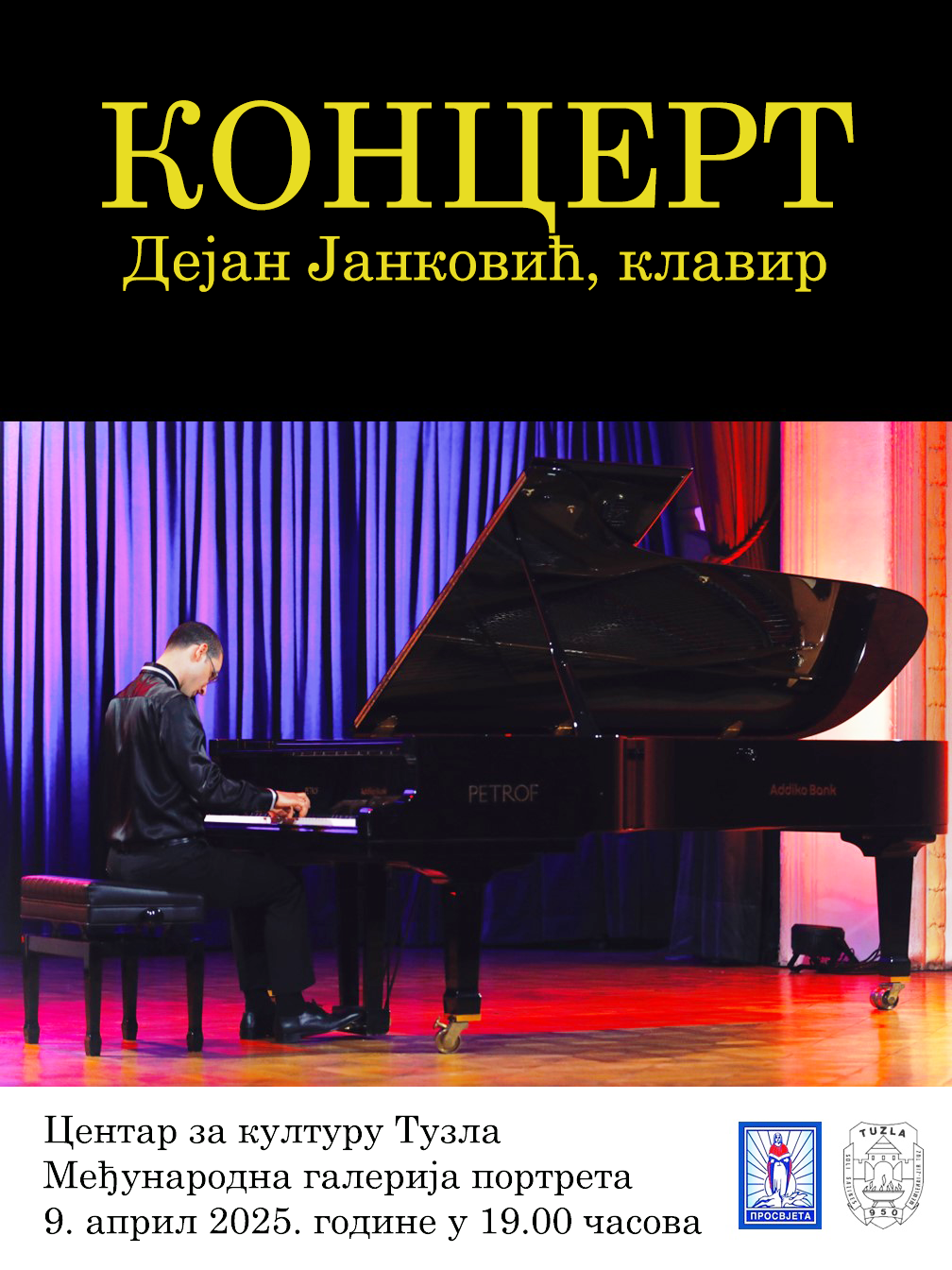 U Međunarodnoj galeriji portreta Centra za kulturu Tuzla 9. aprila (srijeda) 2025. godine u 19.00 časova održaće se koncert pijaniste Dejana Jankovića. Na programu su djela Baha, Ramoa, Šumana, Šopena, Rahmanjinova