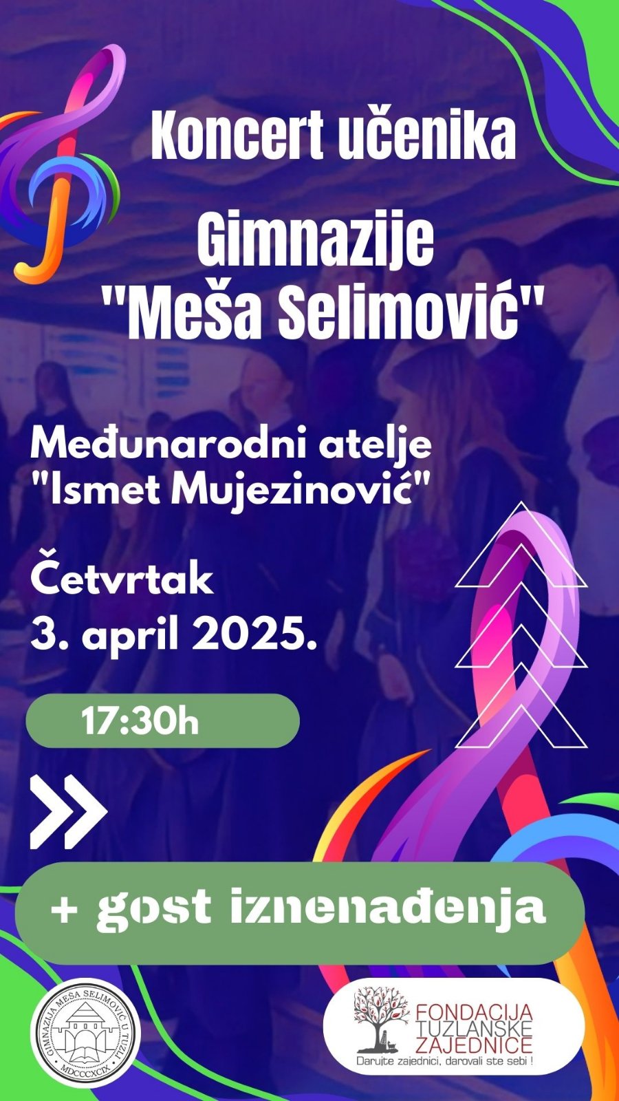 Koncert učenika Gimnazije ‘Meša Selimović’ bit će održan u četvrtak,  3. aprila u Međunarodnom ateljeu ‘Ismet Mujezinović’ Tuzla sa početkom u 17:30 sati.