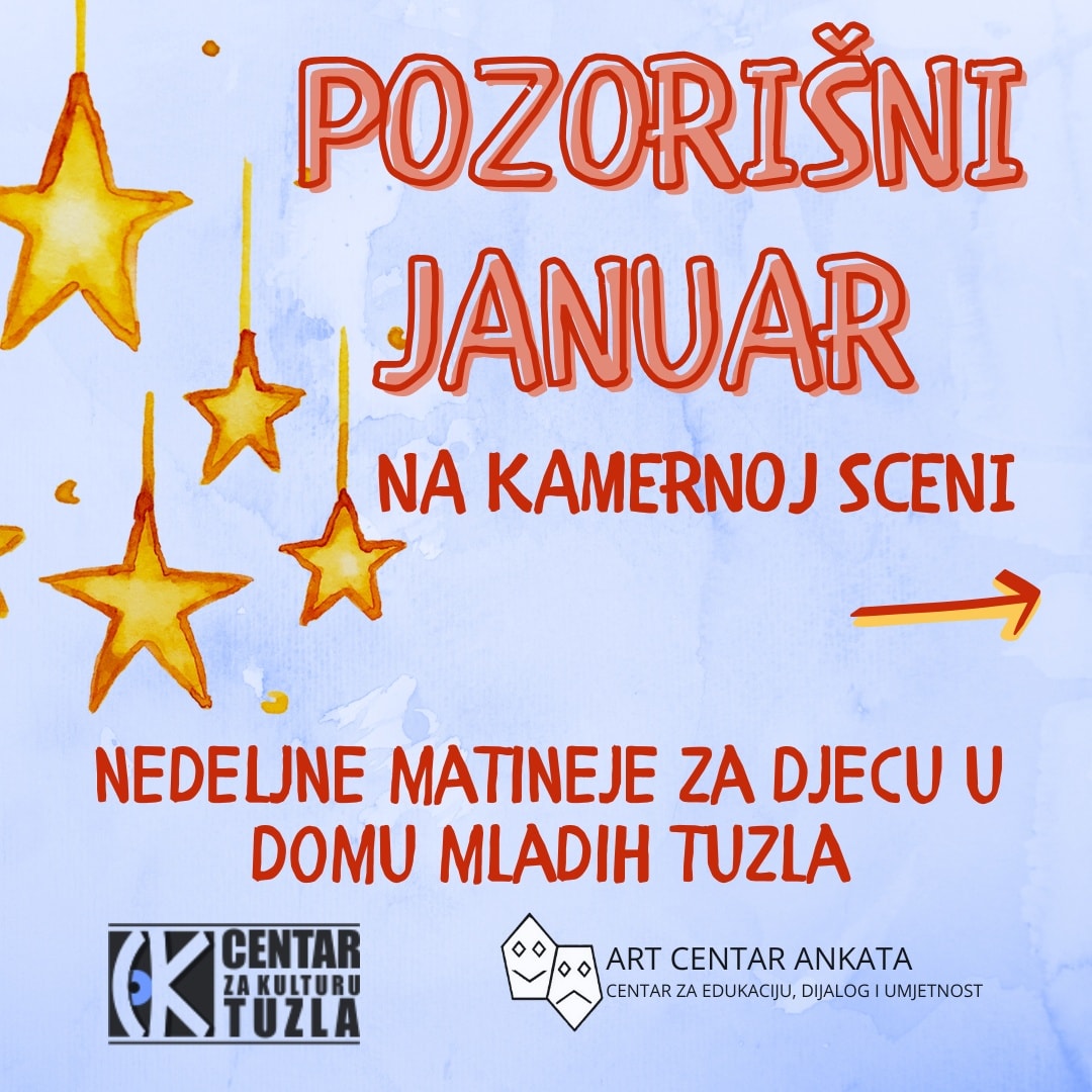 Zadovoljstvo nam ja pozvati sve zainteresovane mališane i njihove roditelje da nas posjete tokom januara 2026.godine na Kamernoj sceni Doma mladih Tuzla, gdje će, u organizaciji “Art centra Ankata”, biti realizovane predstave za djecu u sklopu Pozorišnog januara, a koji se sastoji od nedeljnih matineja za djecu u izvedbi članova udruženja Art centar Ankata Tuzla.