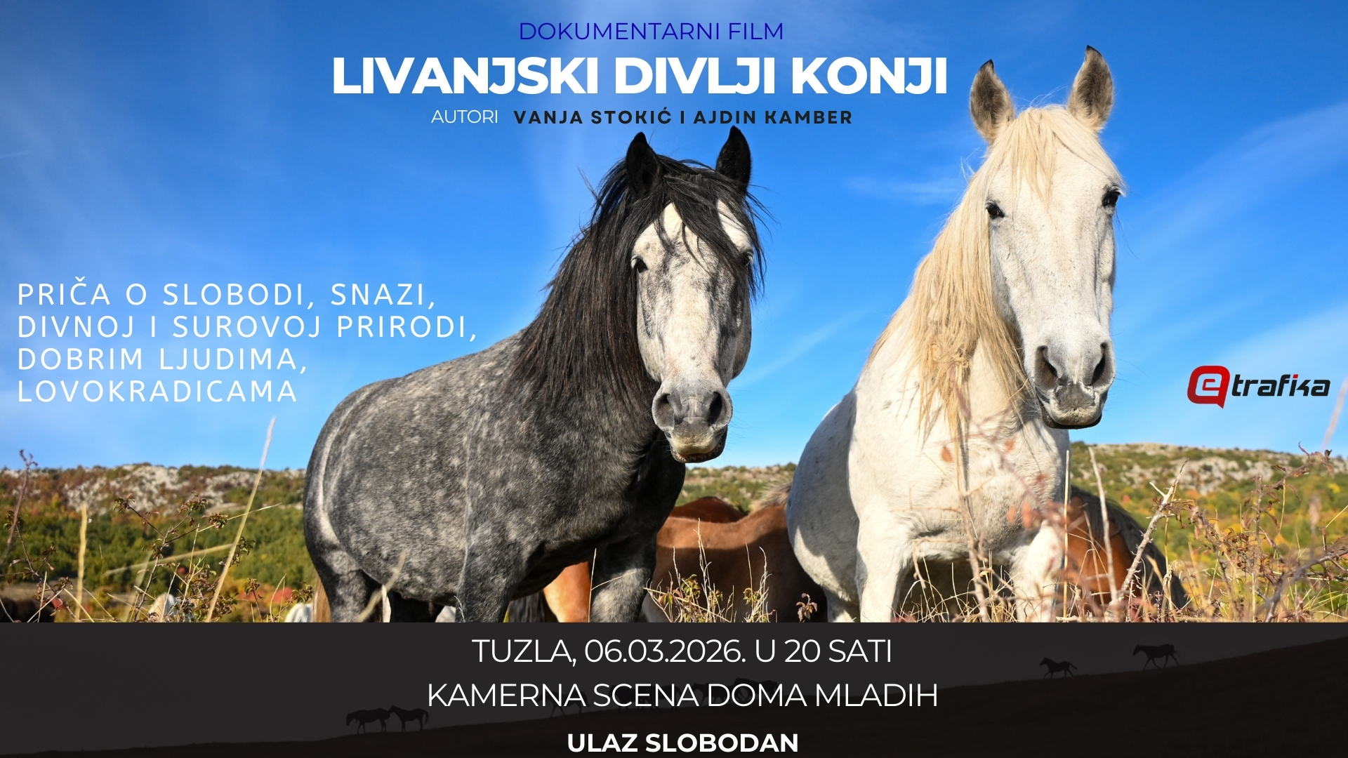 Dokumentarni film eTrafike „Livanjski divlji konji – između slobode i nebrige” biće besplatno prikazan u Tuzli u petak, 6. marta, od 20 sati. Projekcija se organizuje u partnerstvu sa Domom mladih, dokumentarac o konjima možete da pogledate na Kamernoj sceni, ulica Dragiše Trifkovića 2.