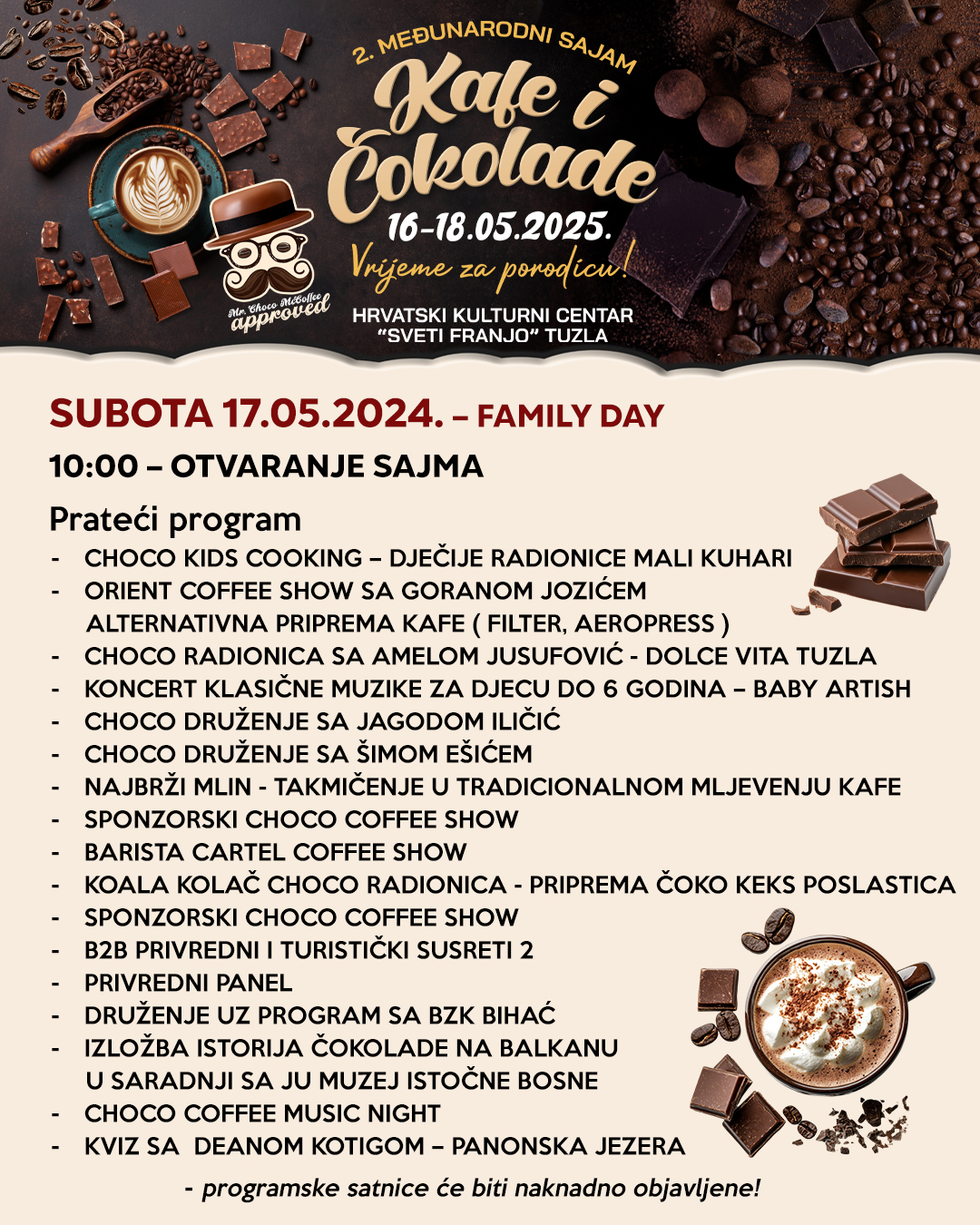 Ovogodišnji sajam donosi još bogatiji i sadržajniji program. Pored značajnog broja izlagača iz oblasti kafe i čokolade, sa posebnim fokusom na handmade čokolaterije i craft kafeterije, posjetitelje očekuje i niz edukativnih sadržaja i kreativnih radionica za djecu i odrasle. Kao i prošle, tako i ove godine Sajam će biti pravo mjesto za sticanje novih znanja, druženje, ali i uživanje u vrhunskim proizvodima. Posebno ističemo Family Day, koji će se održati tokom vikenda, sa raznovrsnim sadržajem za djecu i cijelu porodicu.