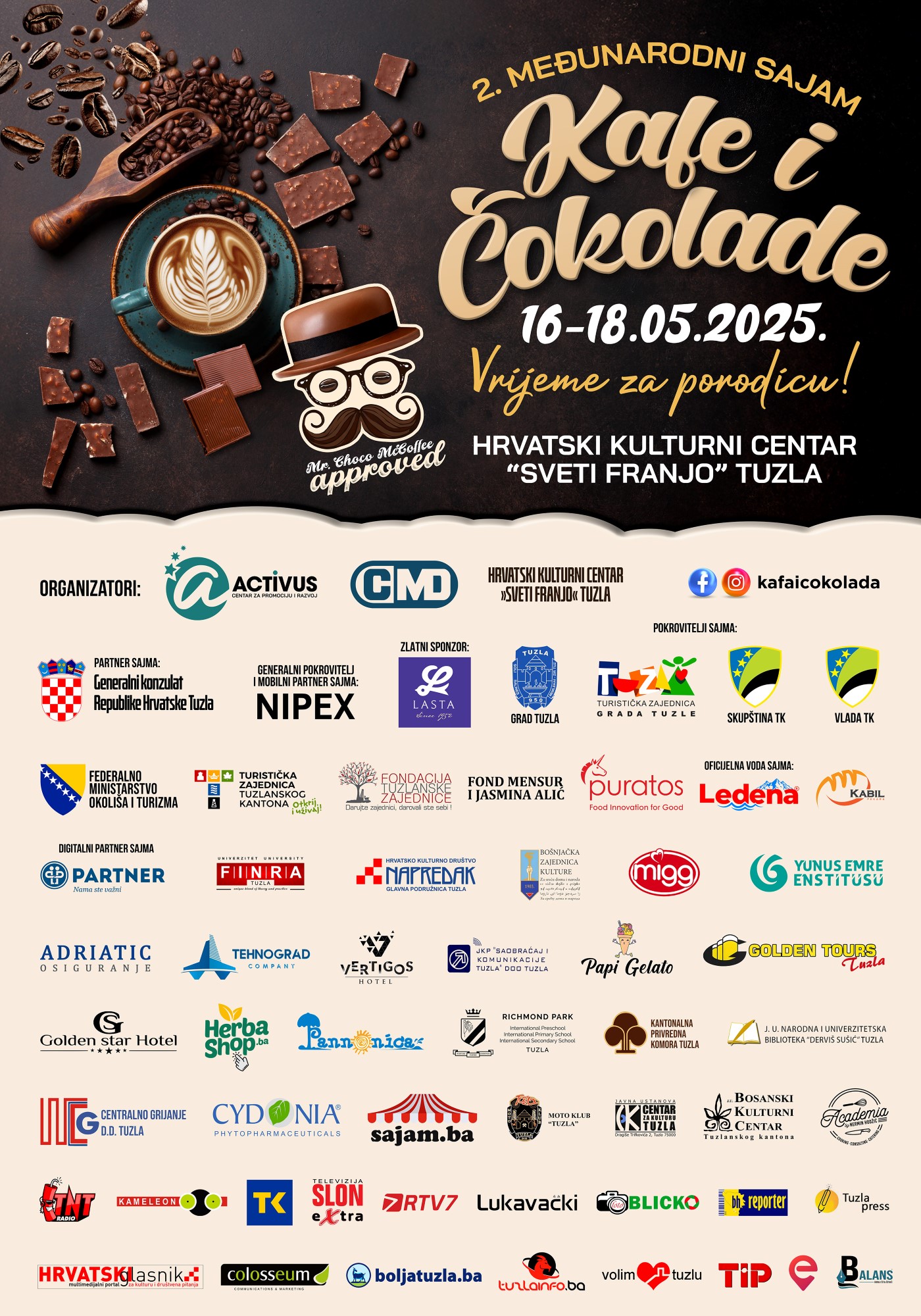 Nakon izuzetnog uspjeha prvog Sajma kafe i čokolade, i više od 10.000 posjetilaca, Tuzla se i ove godine priprema da ponovo postane epicentar najfinijih mirisa, okusa i nezaboravnih doživljaja. Sa velikim zadovoljstvom najavljujemo održavanje 2. Međunarodnog sajma kafe i čokolade, od 16. do 18. maja 2025. godine u prostoru Hrvatskog kulturnog centra “Sveti Franjo” u Tuzli u organizaciji UG Activus.